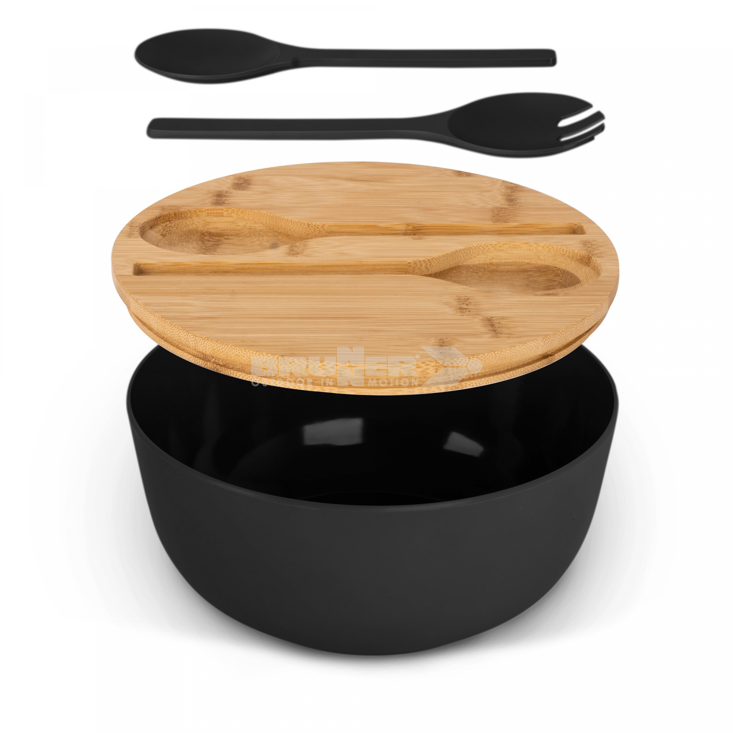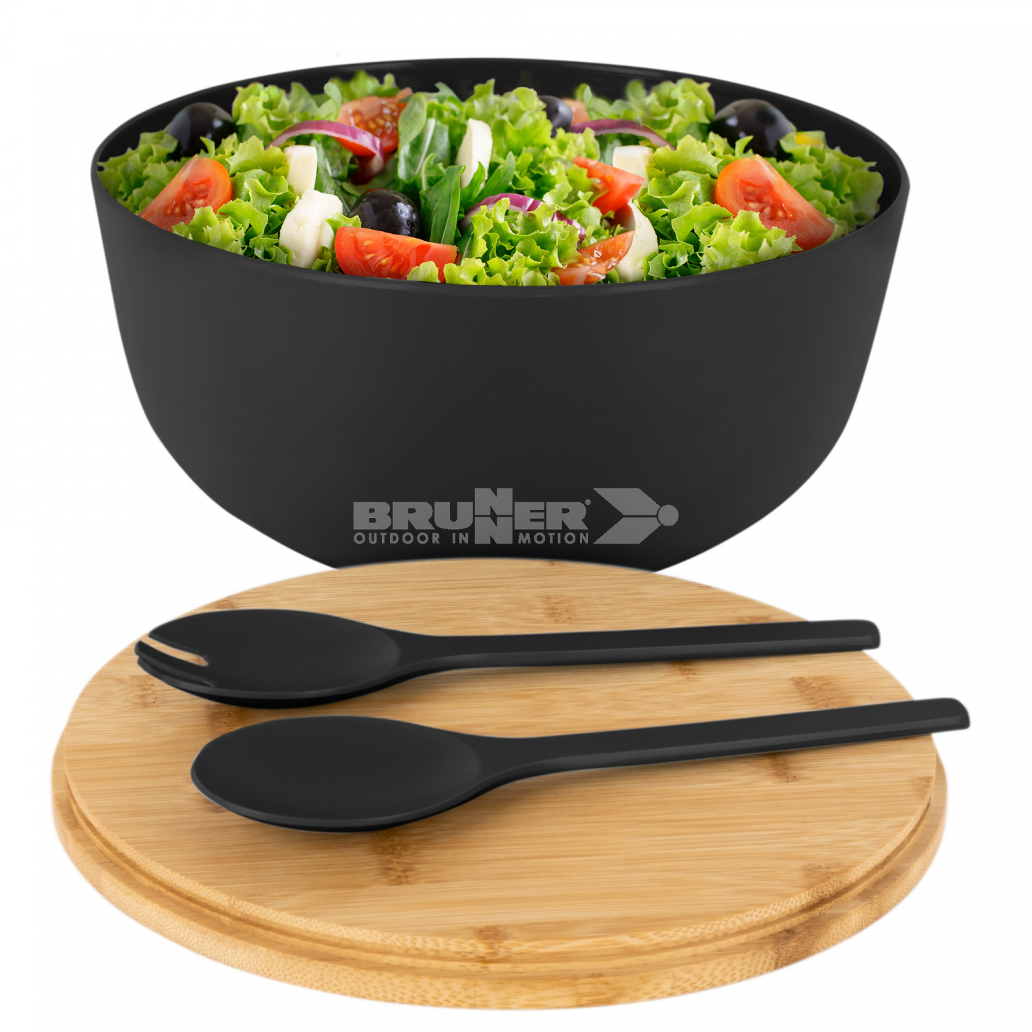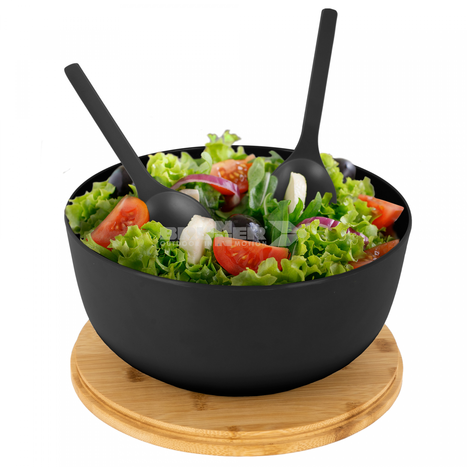 Bellissimo e pratico set in melamina e legno per gustare deliziose insalate anche in campeggio. Le posate possono essere riposte nel coperchio, per una soluzione particolarmente salvaspazio. Fondo antiscivolo