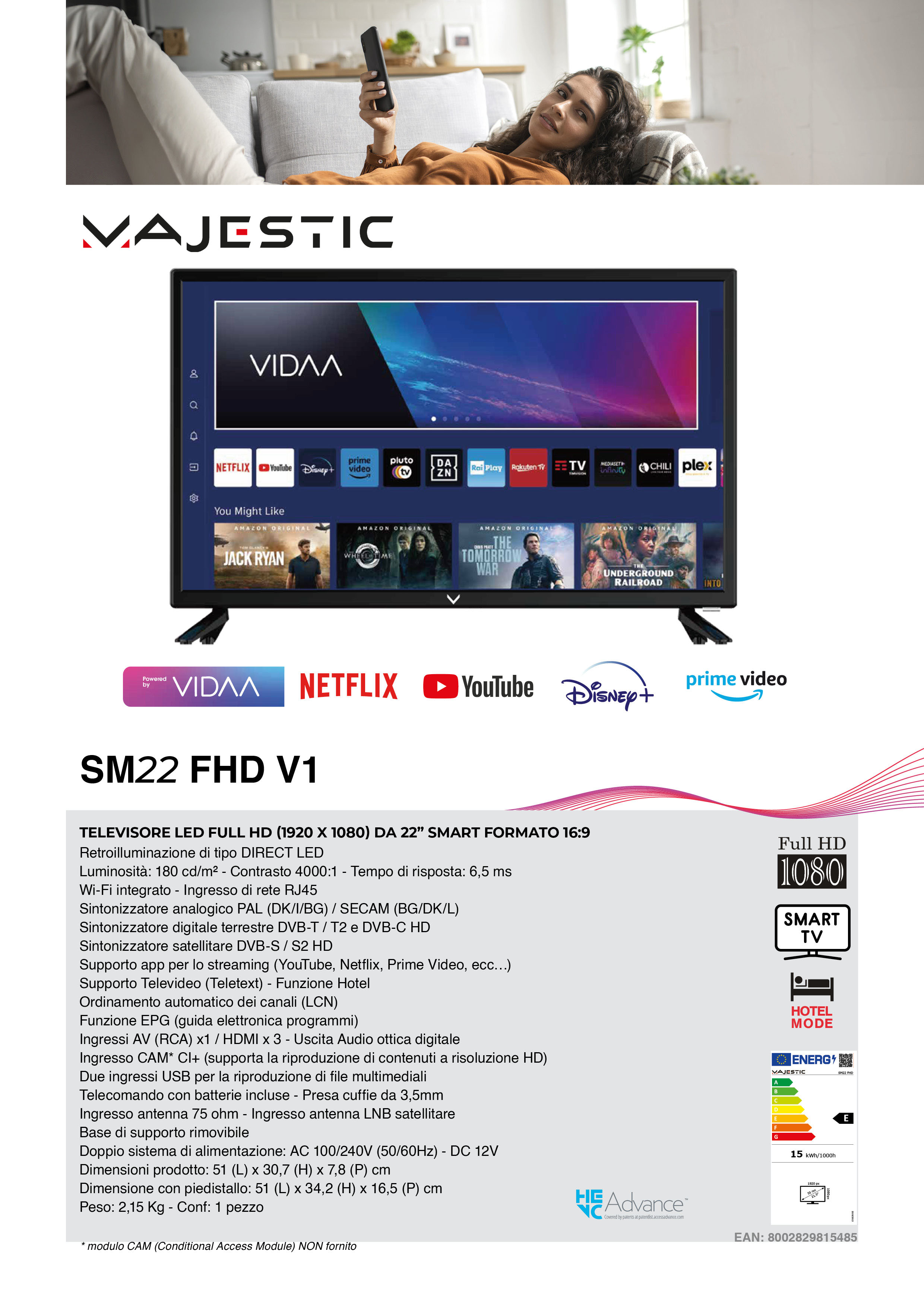 TV Smart LED MAJESTIC SM22: Scopri il massimo della flessibilità con il nostro TV Smart LED da 22” Full HD. Grazie al sistema operativo VIDAA, avrai accesso a streaming di alta qualità su app come YouTube, Netflix e Prime Video. Il TV offre immagini nitide (1920 x 1080) con contrasto 4000:1 e retroilluminazione DIRECT LED. La vera innovazione? La doppia alimentazione, che ti permette di utilizzare il TV sia con corrente AC che con DC 12V, grazie all’adattatore per accendisigari incluso. Con Wi-Fi integrato, ingressi multipli e un design compatto, è ideale per qualsiasi spazio.